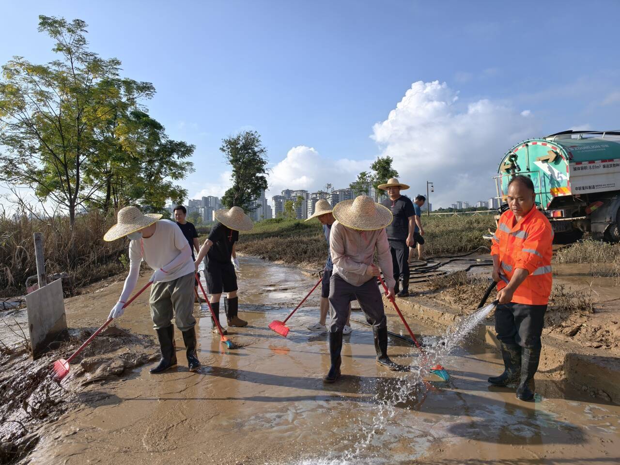 上午8點(diǎn),志愿者們攜帶鐵鏟、刮泥板、掃帚、垃圾袋等工具,準時(shí)在指定區域集合?,F場(chǎng)的淤泥最深處達10余厘米,腳一踩便陷進(jìn)去難以拔出,鏟子剛插進(jìn)泥里就被牢牢黏住?!按蠹曳止じ?,先刮表層泥,再清垃圾!” 隨著(zhù)一聲號召,志愿者們迅速分組行動(dòng):有的彎腰緊握刮泥板,順著(zhù)步道紋理反復刮除黏連的淤泥;有的扛著(zhù)水管,利用高壓水槍沖刷地面;有的拎著(zhù)垃圾袋,蹲下身細致?lián)焓安卦诓菘p里的垃圾;有的則推著(zhù)清運車(chē),來(lái)回穿梭將裝滿(mǎn)淤泥和垃圾的袋子及時(shí)運離現場(chǎng)…… 各個(gè)環(huán)節銜接緊密、井然有序。盡管天氣炎熱,汗水順著(zhù)臉頰滑落、浸透衣衫,志愿者們的熱情與干勁絲毫未減,充分展現了國企的責任與擔當。